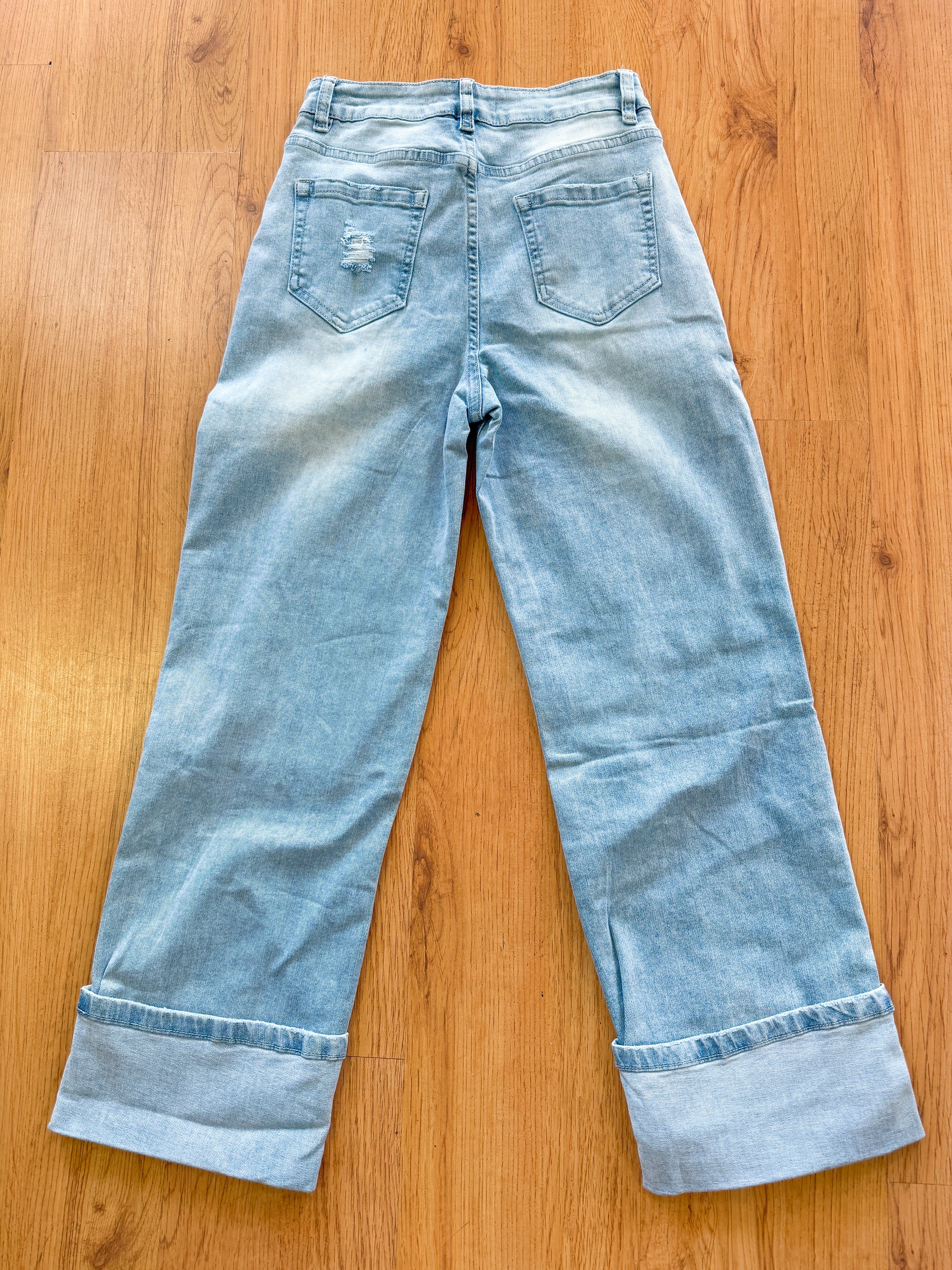 Bring some edge to your denim lineup with these light-wash distressed wide-leg jeans. Featuring intentional rips and frayed details throughout, they strike the perfect balance between laid-back and bold. The roomy wide-leg cut and extra-wide cuffed hems add a modern, effortless vibe. Soft, relaxed, and full of character—these jeans are made for easy, everyday cool.
